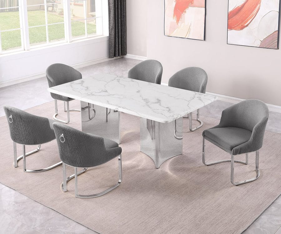 D462-3 + SC300-7: 9pc White Marble Dining Set (Silver & Gold)