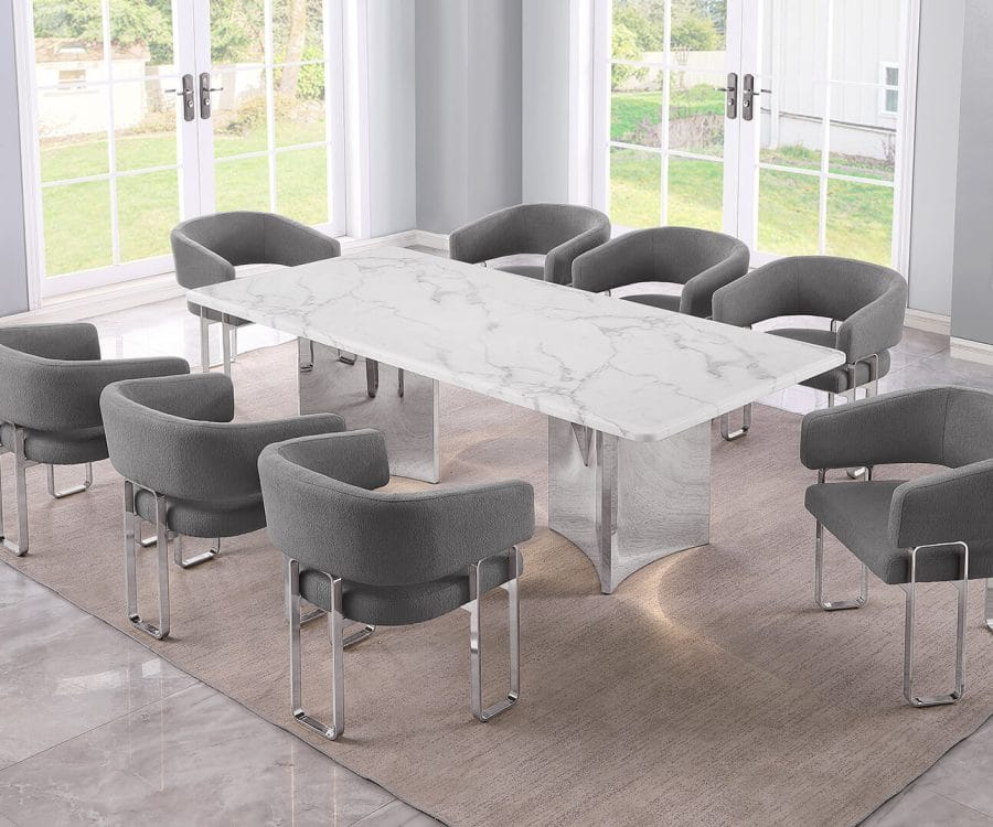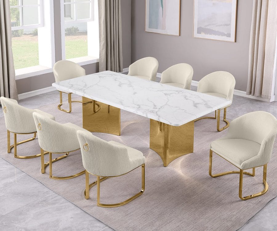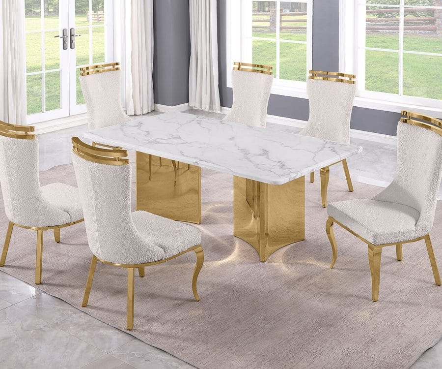 D462-3 + SC370-7: 9pc White Marble Dining Set (Silver & Gold)