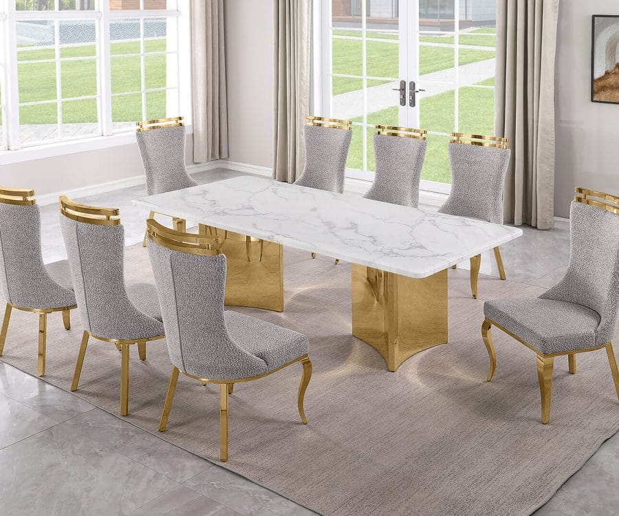 D462-3 + SC390-7: 9pc White Marble Dining Set (Silver & Gold)