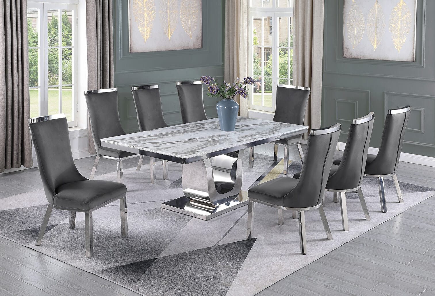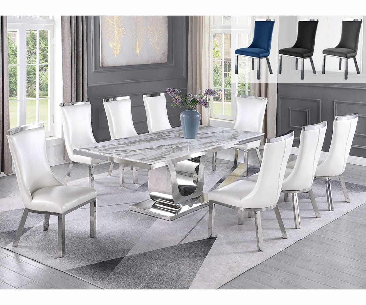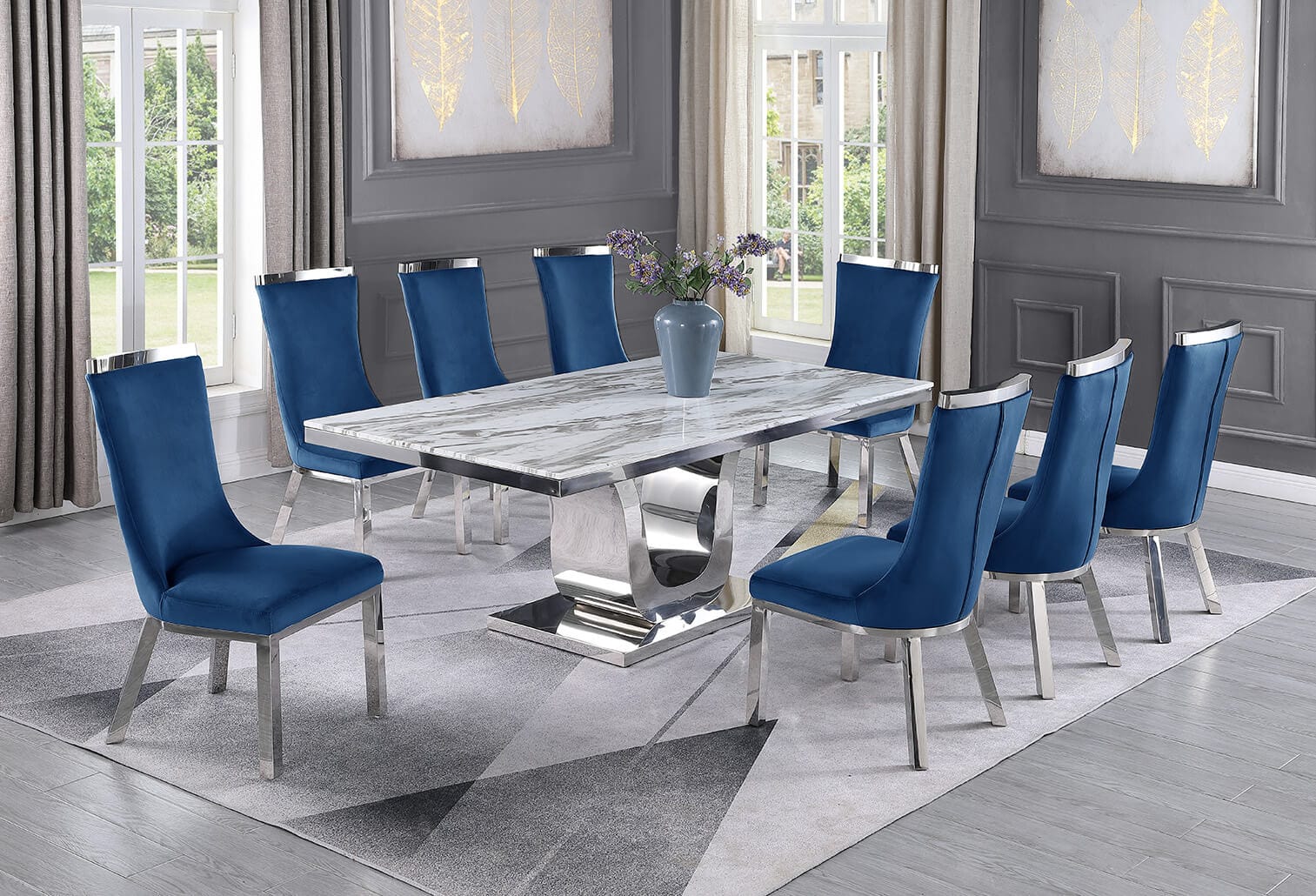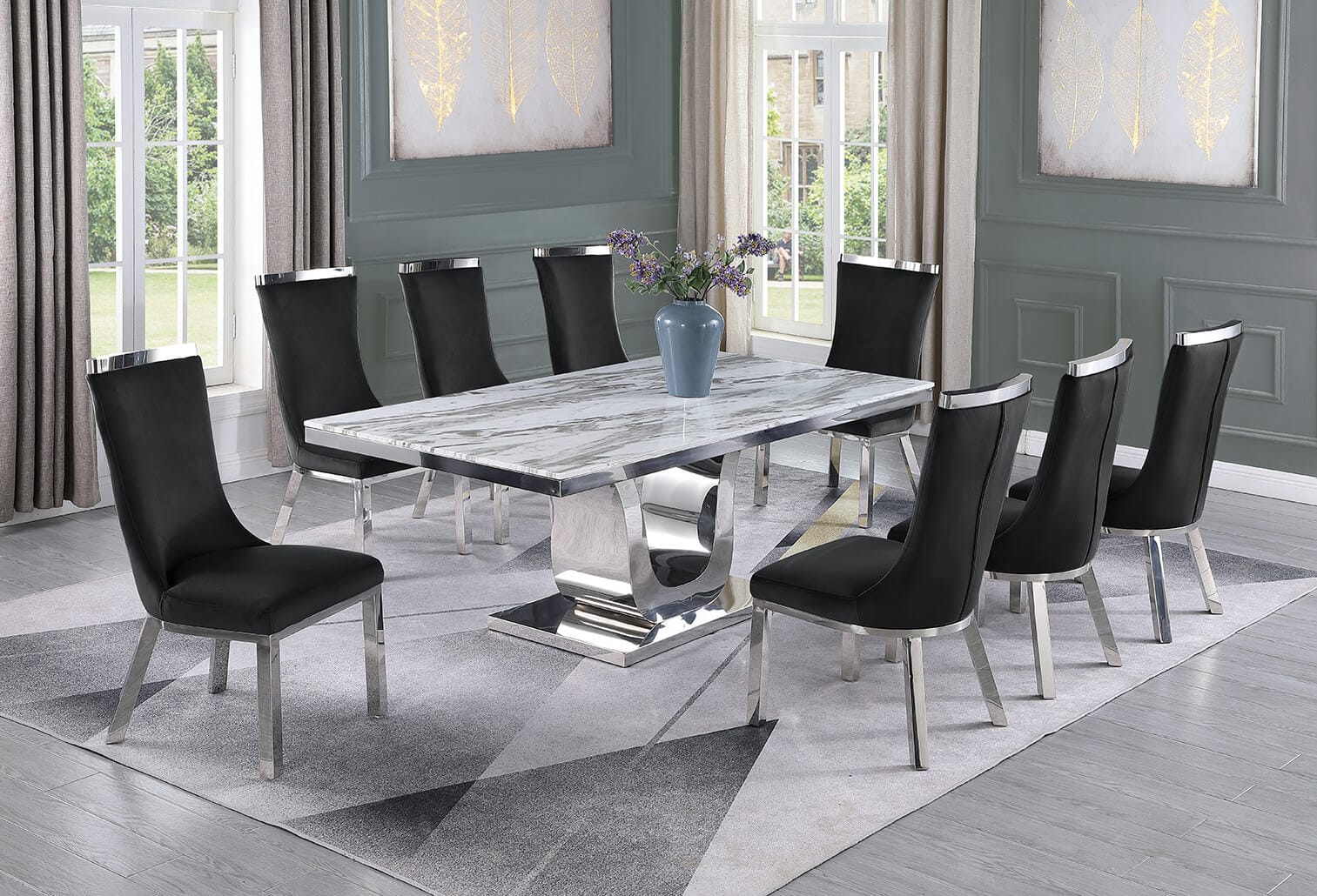 Upgrade your dining space with our complete 9-piece set with table and 8 side chairs. This set includes a large, rectangular dining table with white marble top, sat on top of a luxurious polished stainless steel U-shaped base. The side chairs boast a matching stainless steel frame, and are available in upholstery colors dark gray velvet, navy blue velvet, black velvet, and white faux leather.