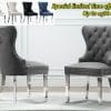 Classic 5 piece dining set that comes with a white marble top and stainless steel base dining table with velvet or faux leather side chairs with tufted buttons, double nailhead trim, and ring handle in the back.
