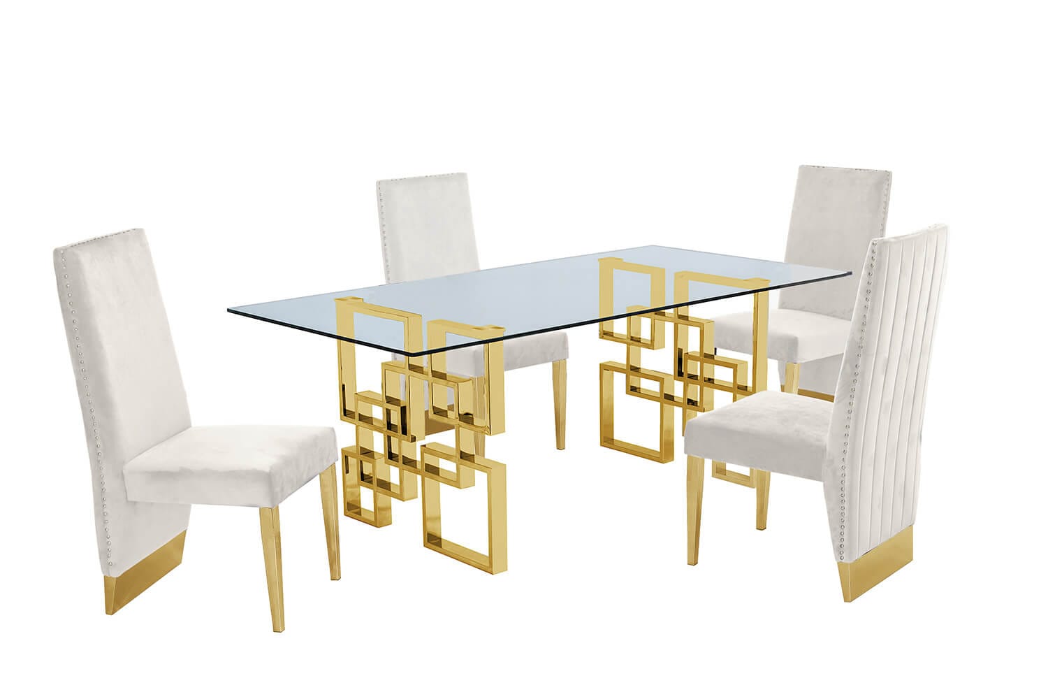 Best Quality Furniture’s versatile D221-DT dining table, paired with our exquisite SC160-7 chair series. This exceptional dining table boasts a 12mm clear tempered glass top paired with a sturdy stainless steel base, ensuring both elegance and durability. Our velvet dining chairs features a tall chair back with vertical line tufted design and nail-head trim. Choose from a range of upholstery colors including Dark Gray, Navy Blue, Black, and Cream, to complement your decor perfectly.