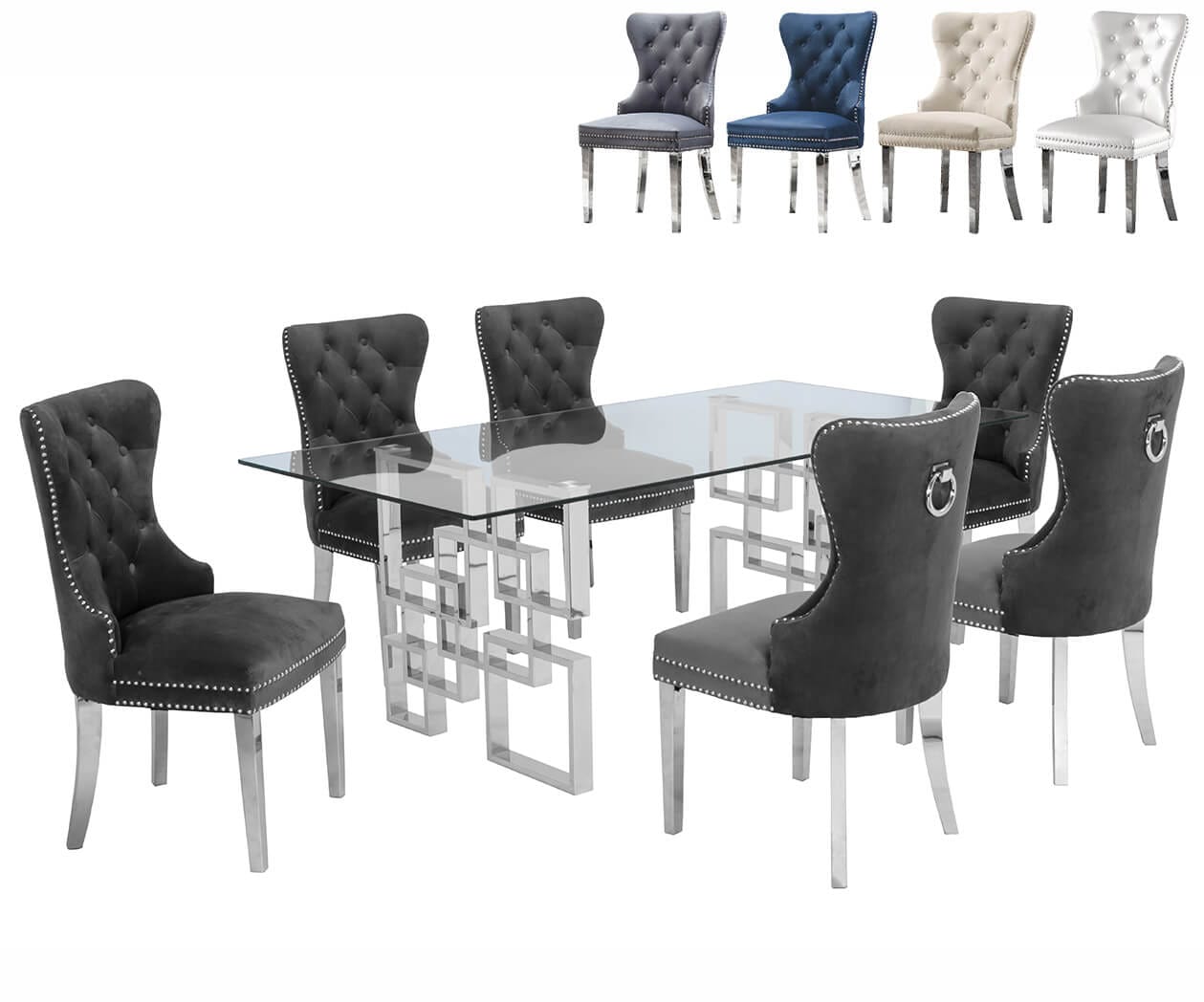 Best Quality Furniture’s versatile D221-DT dining table, paired with our exquisite SC44-48 chair series. This exceptional dining table boasts a 12mm clear tempered glass top paired with a sturdy stainless steel base, ensuring both elegance and durability. Our velvet dining chairs features a classic button tufted design and nail-head trim. Choose from a range of upholstery colors including Dark Gray, Navy Blue, Black, and Cream, to complement your decor perfectly.