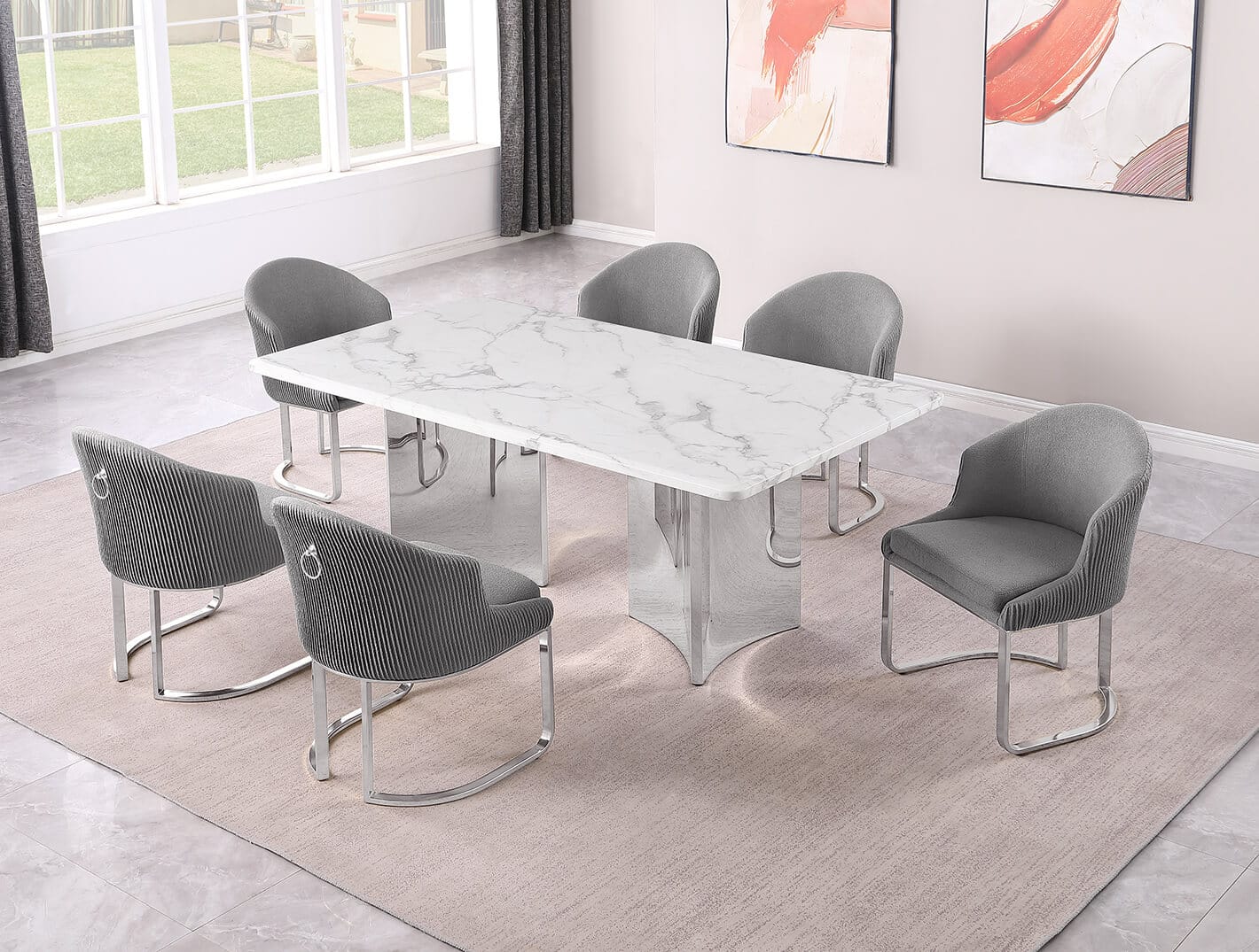 A modern 7 piece dining set with white marble table and teddy fabric side chairs. The white marble is 38mm thick and is paired with sturdy stainless steel legs with a polished finish. The chairs are available in 4 colors to choose from and has pre-installed floor adjusters to help prevent wobble.