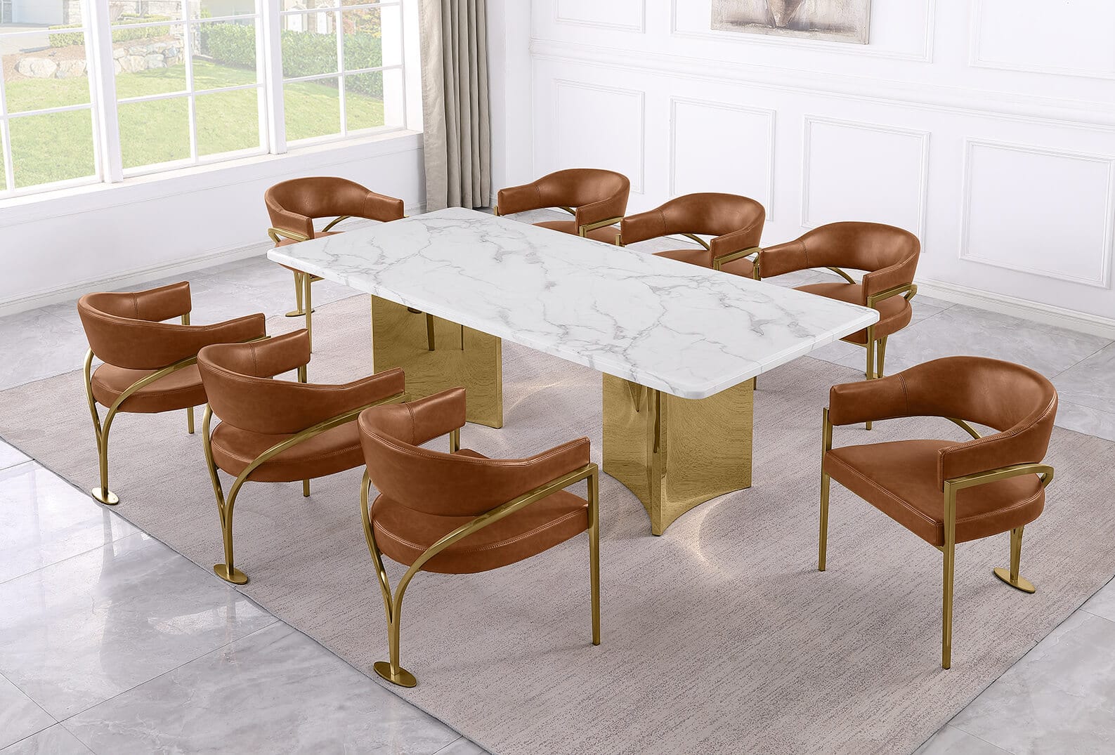 A modern 9 piece dining set with white marble table and leathaire (faux leather) fabric side chairs. The white marble is 38mm thick and is paired with sturdy stainless steel legs with a polished finish. The chairs are available in 3 colors to choose from and has a matte chrome finish to create a subtle contrast with the table.