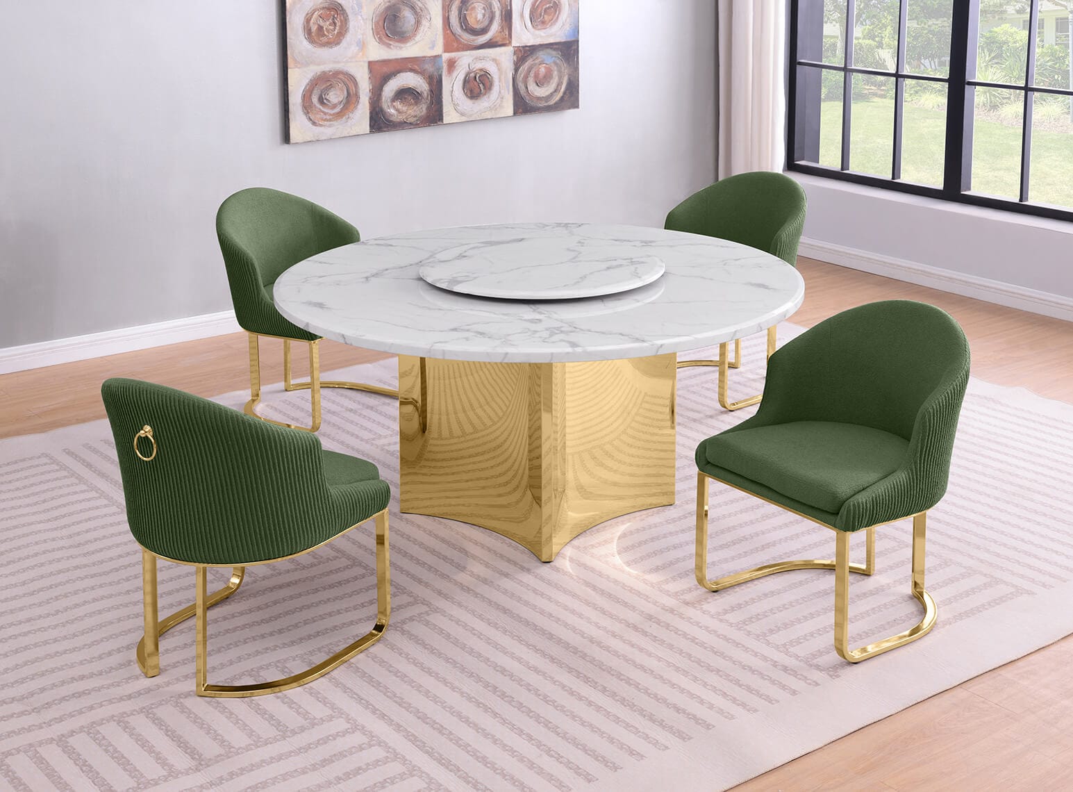 A modern 5 piece dining set with white marble table and teddy fabric side chairs. The white marble is 38mm thick and is paired with sturdy stainless steel legs with a polished finish. The chairs are available in 4 colors to choose from and has pre-installed floor adjusters to help prevent wobble.