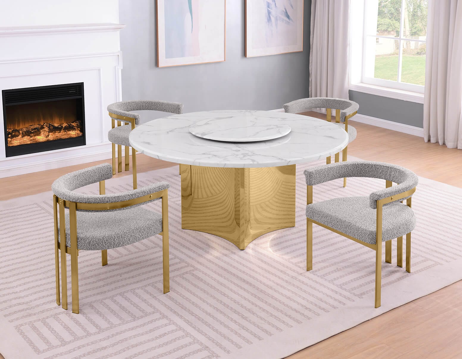 A modern 5 piece dining set with white marble table, matching lazy susan, and boucle fabric side chairs. The white marble is 38mm thick and is paired with sturdy stainless steel legs with a polished finish. The chairs are available in 4 colors to choose from and has a matte chrome finish to create a subtle contrast with the table.