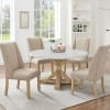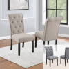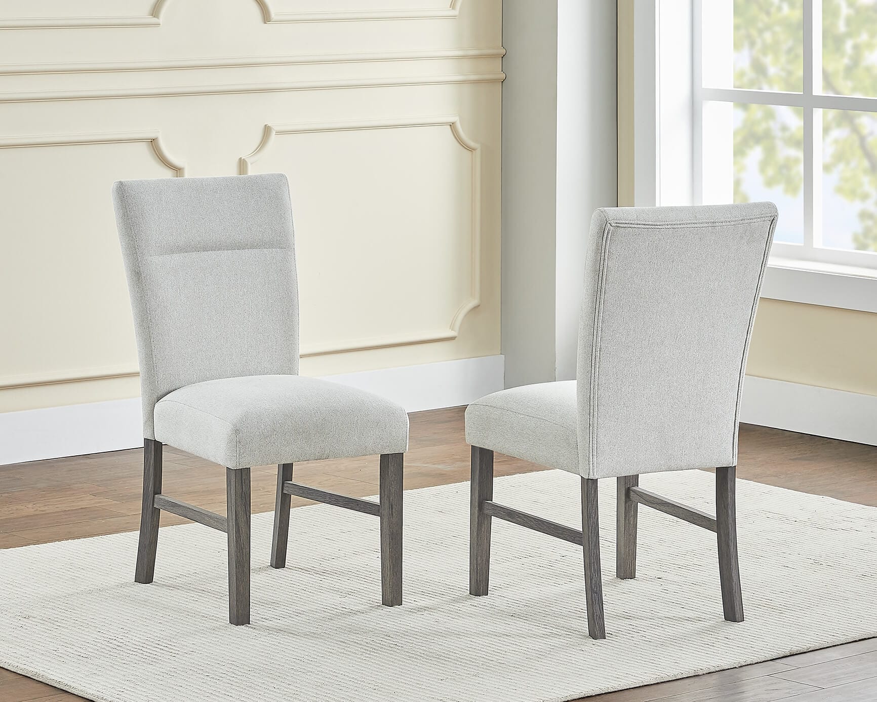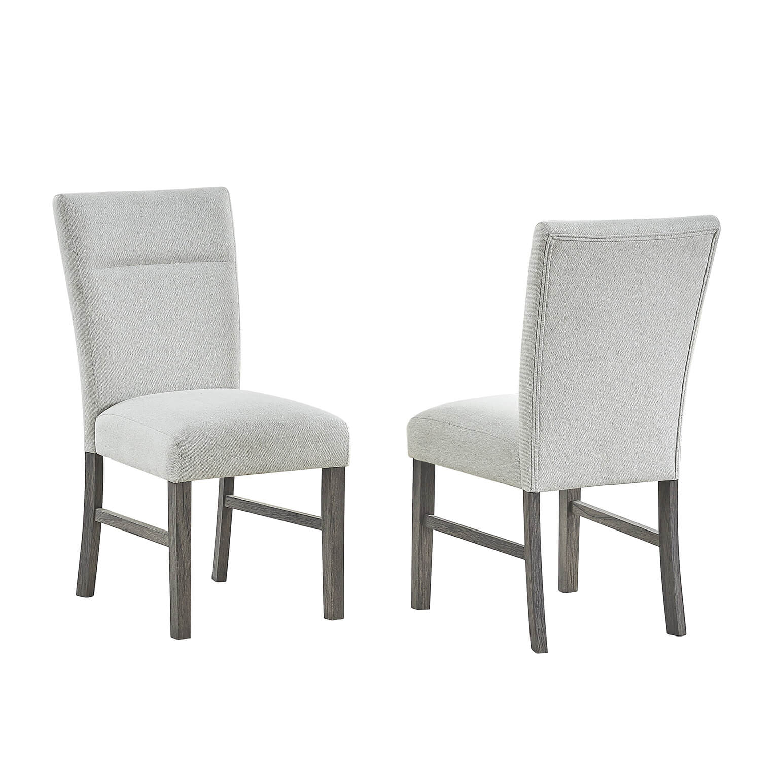 Upholstered chairs in soft, light gray fabric. Perfect blend of industrial and contemporary style for everyday dining or entertaining. With leg stretchers for added support and built-in floor adjusters, these chairs are durable, stylish, and functional. One purchase includes 2 chairs.