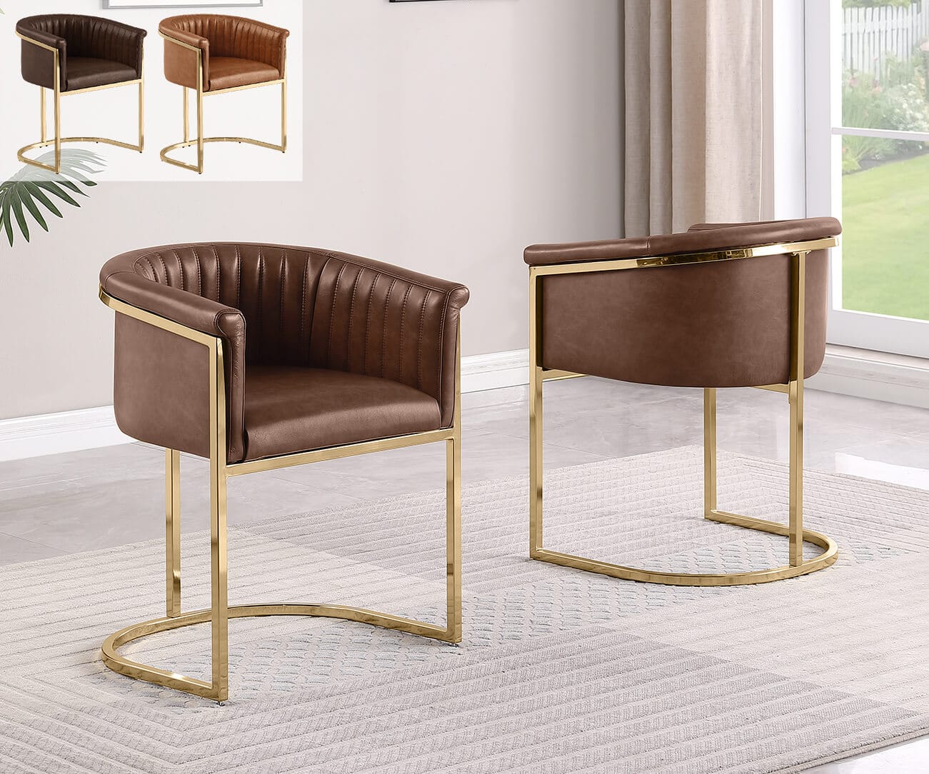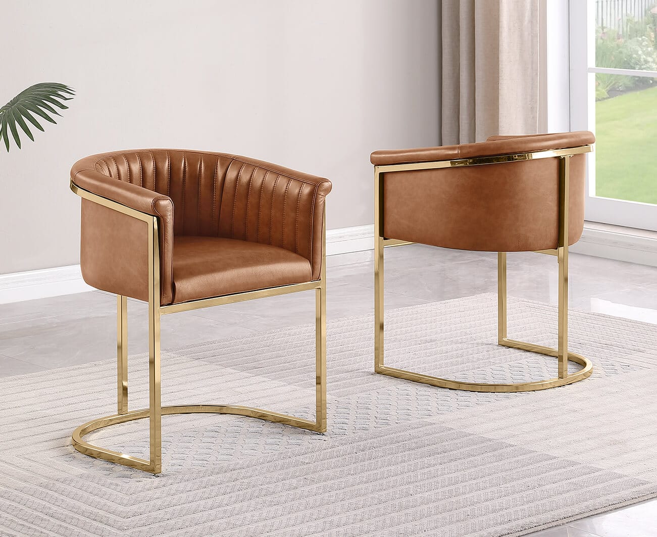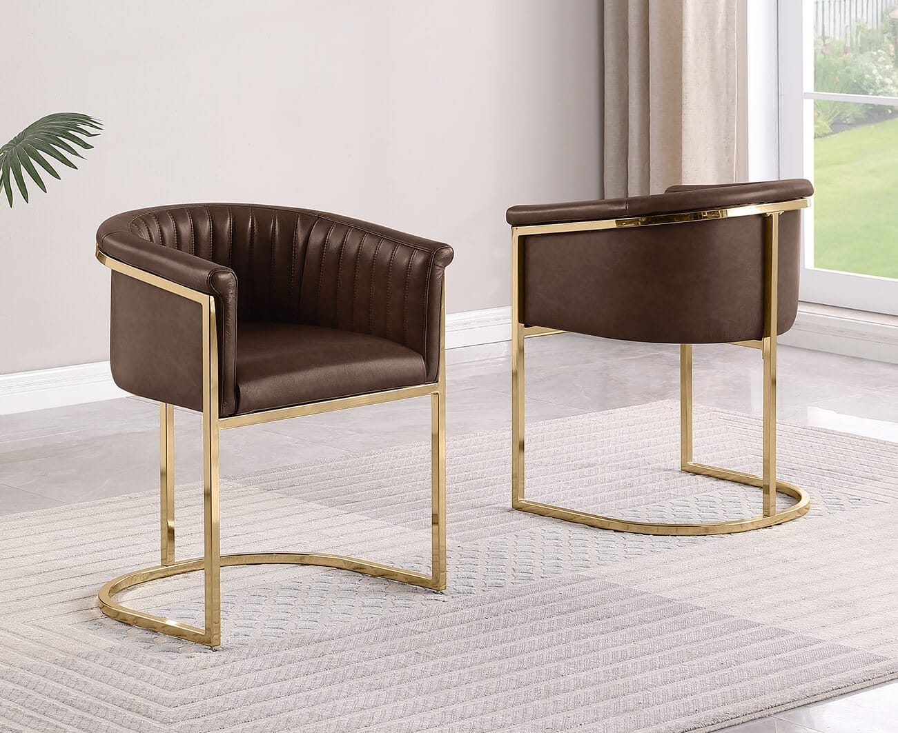 Add a touch of modern luxury to your space with this pair of Leathaire (faux leather) arm chairs, featuring a sleek gold chrome frame and vertical channel stitching. The soft, durable Leathaire upholstery mimics genuine leather while being easy to maintain, and is available in colors Mocha, Toffee, and Espresso. Perfect for dining rooms, offices, or lounge areas, these stylish chairs enhances any modern or glam interior.