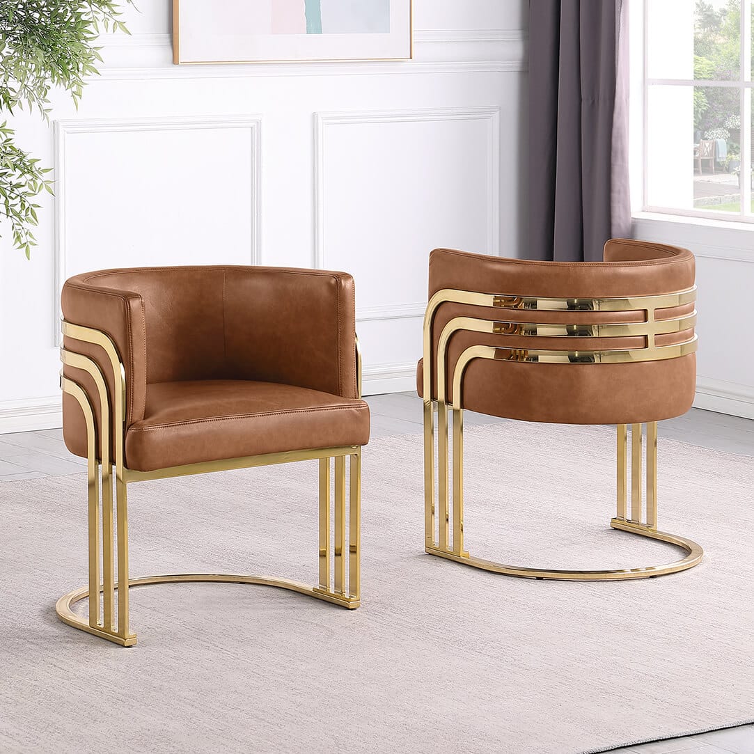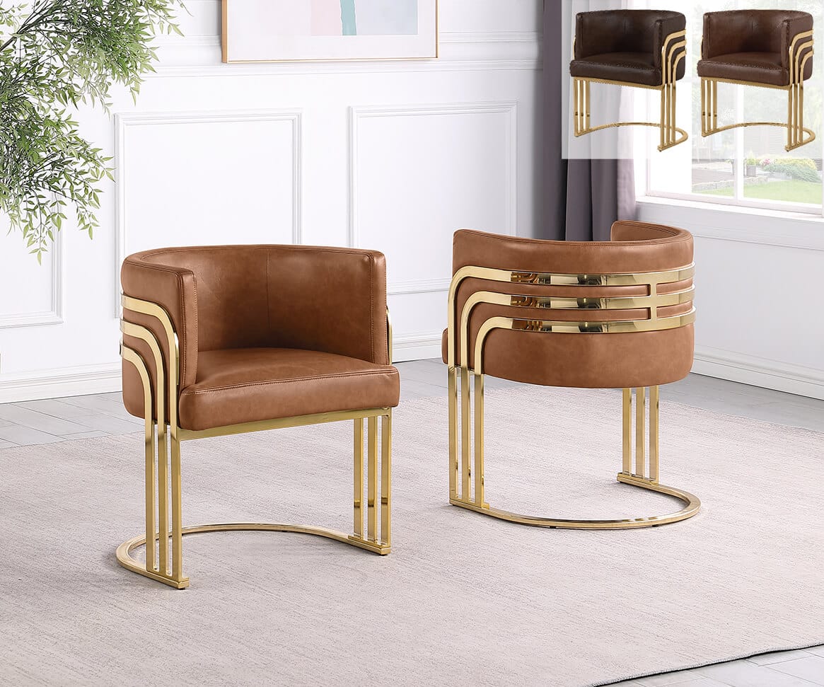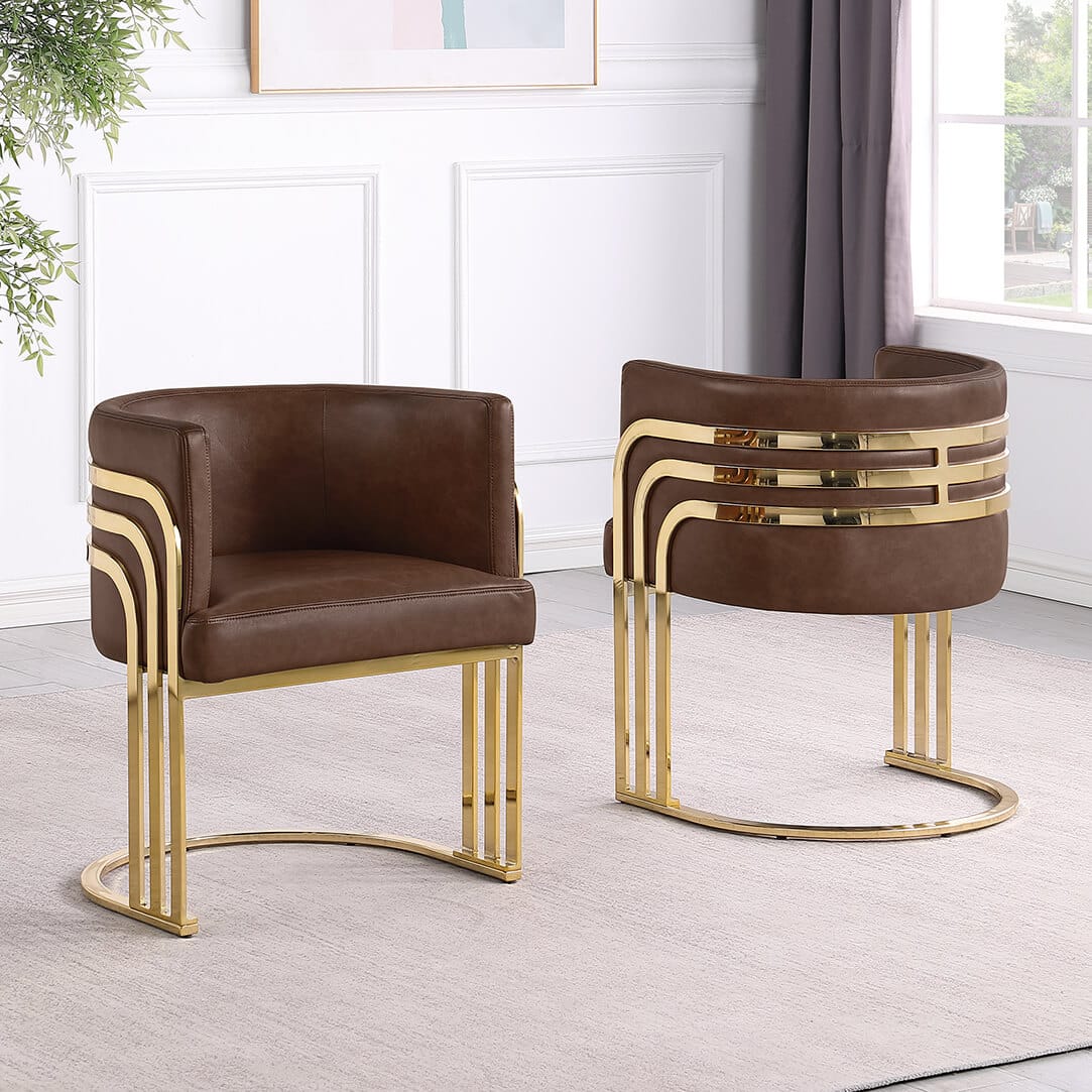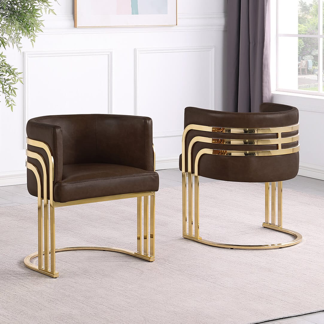 Elevate your space with this modern Leathaire side chair featuring a sleek gold chrome frame. These chairs are a fresh take on one of our top selling series, SC024 – 7. Designed with a barrel back cushion and striped gold bands, this chair blends luxury and comfort for any dining room, living room, or office. Available in upholstery colors Mocha, Toffee, and Espresso. Assembly required.