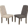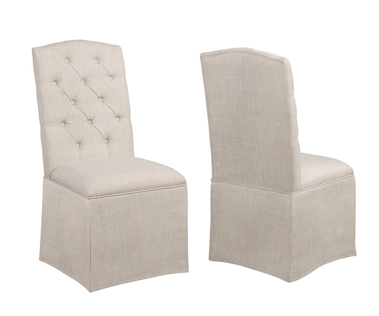 A set of 2 beige linen skirt chairs with button tufted back. No assembly required!