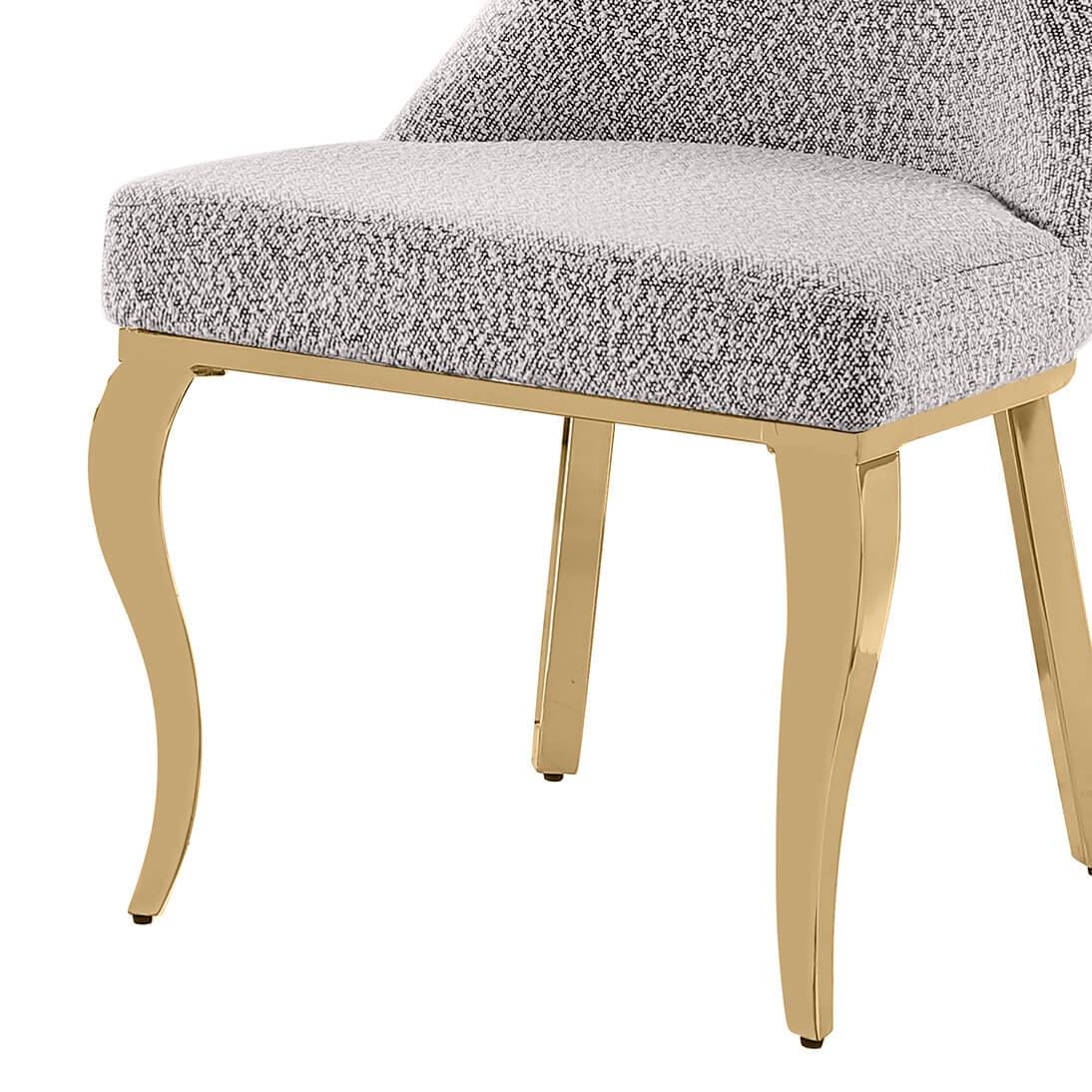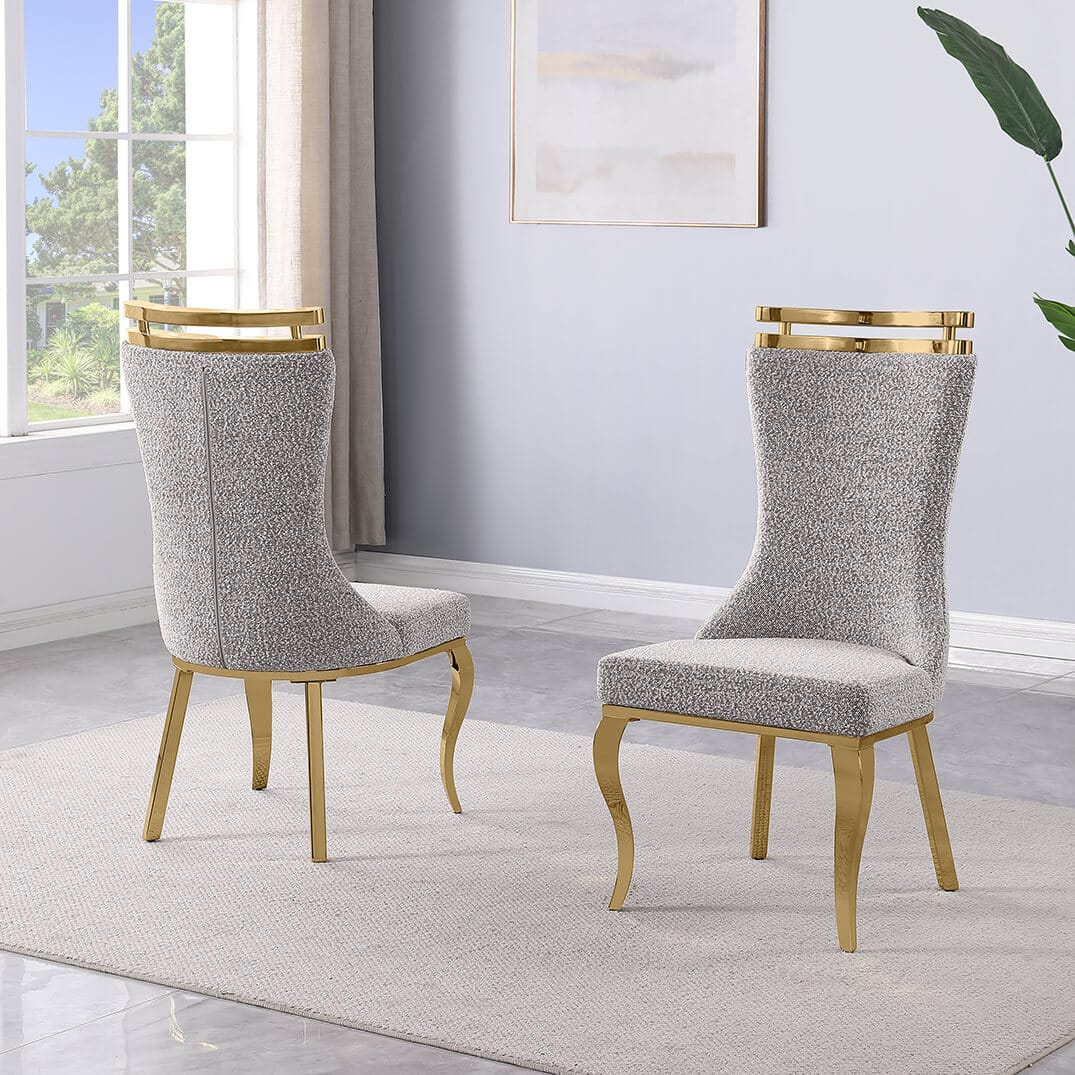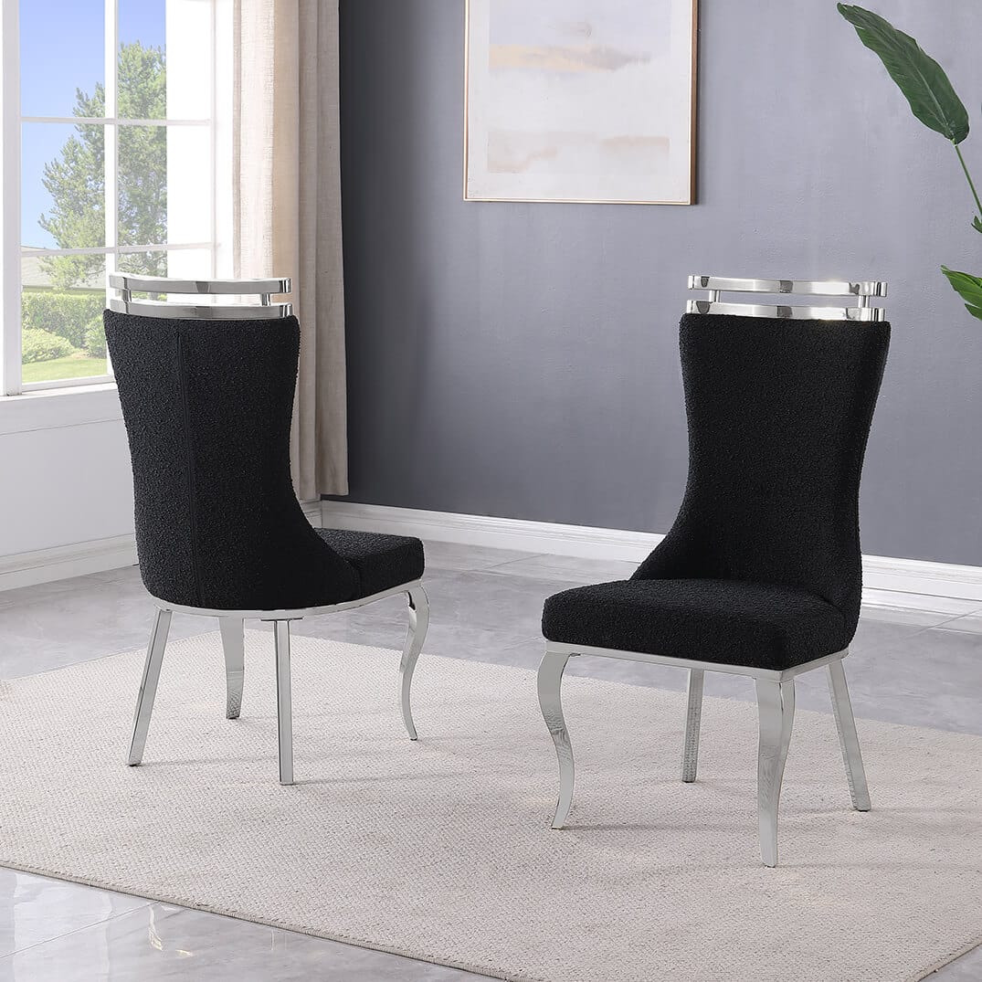Create a sophisticated look in your dining space with these boucle fabric side chairs with polished chrome frame. With 4 upholstery colors and 2 finishes to choose from, these chairs will surely elevate your home. Equipped with pre-installed floor levelers to help prevent wobble.