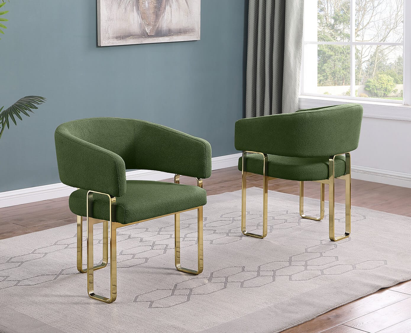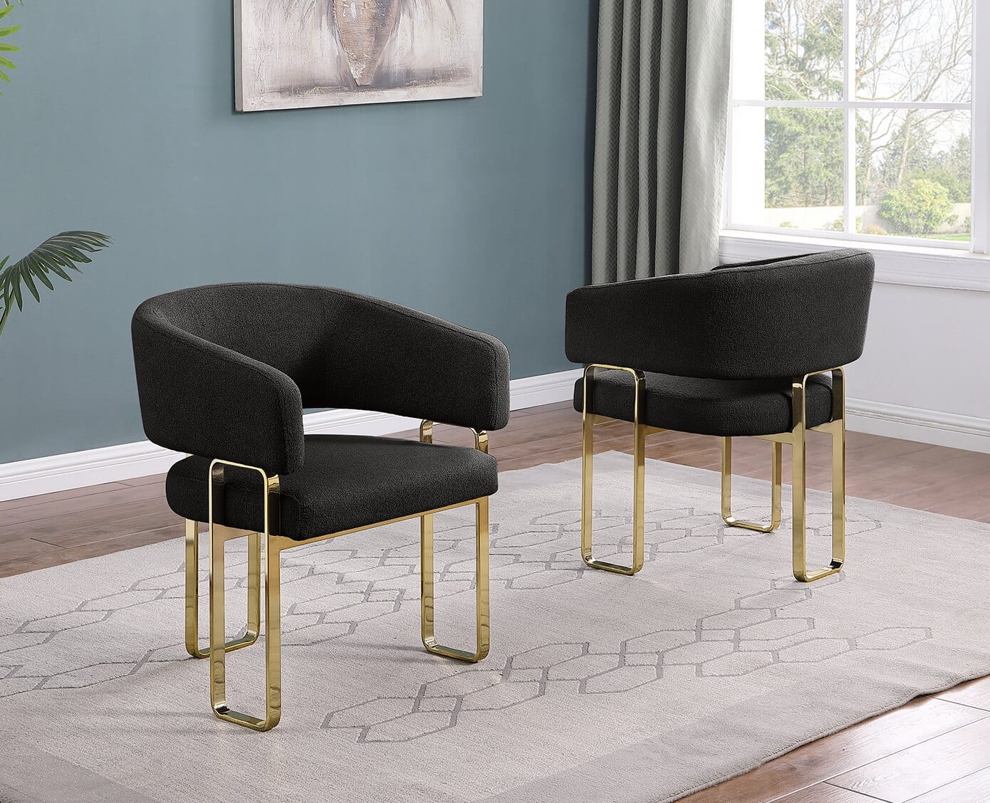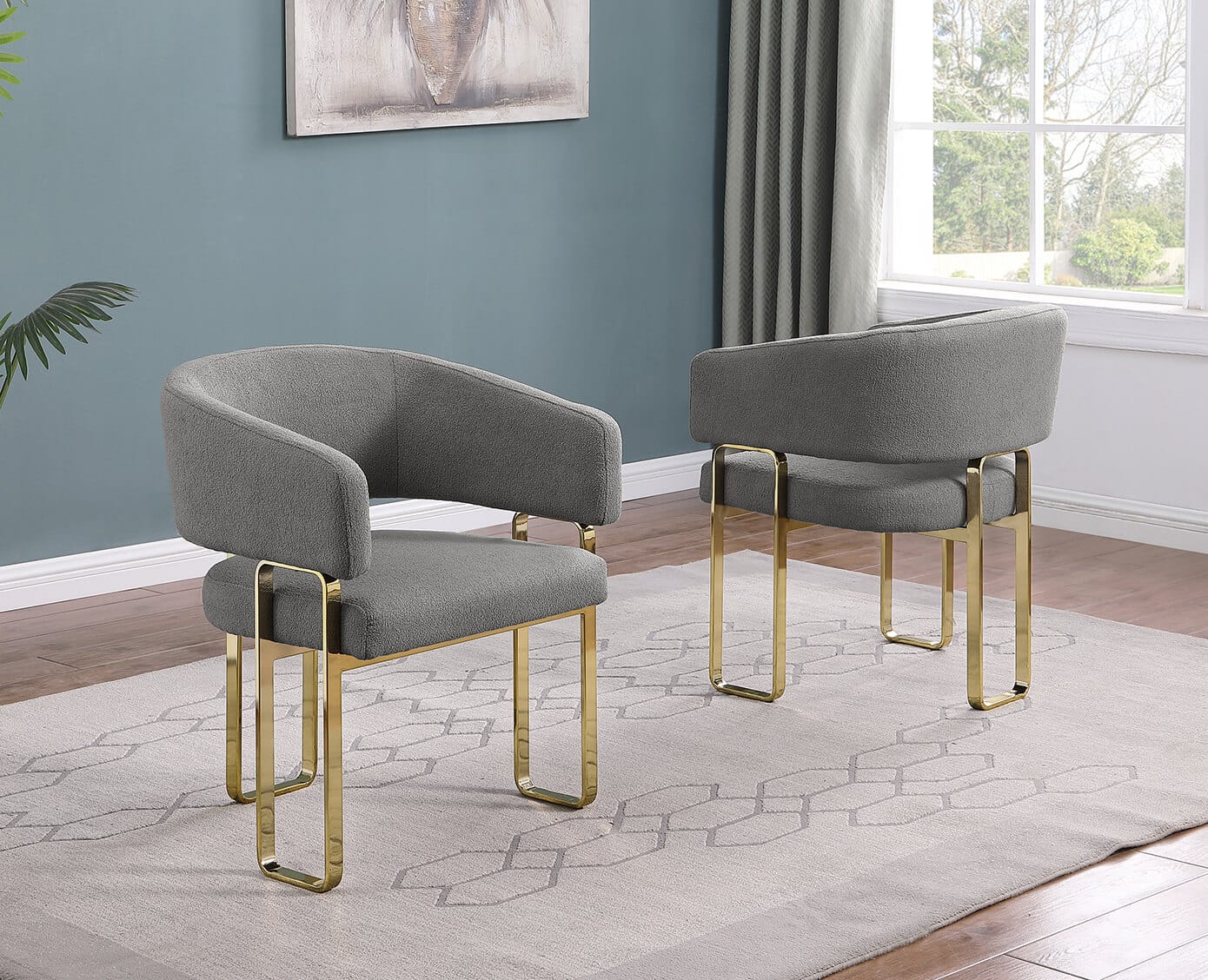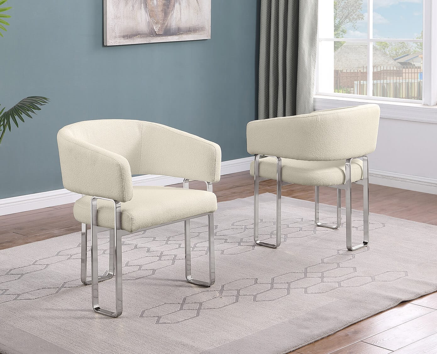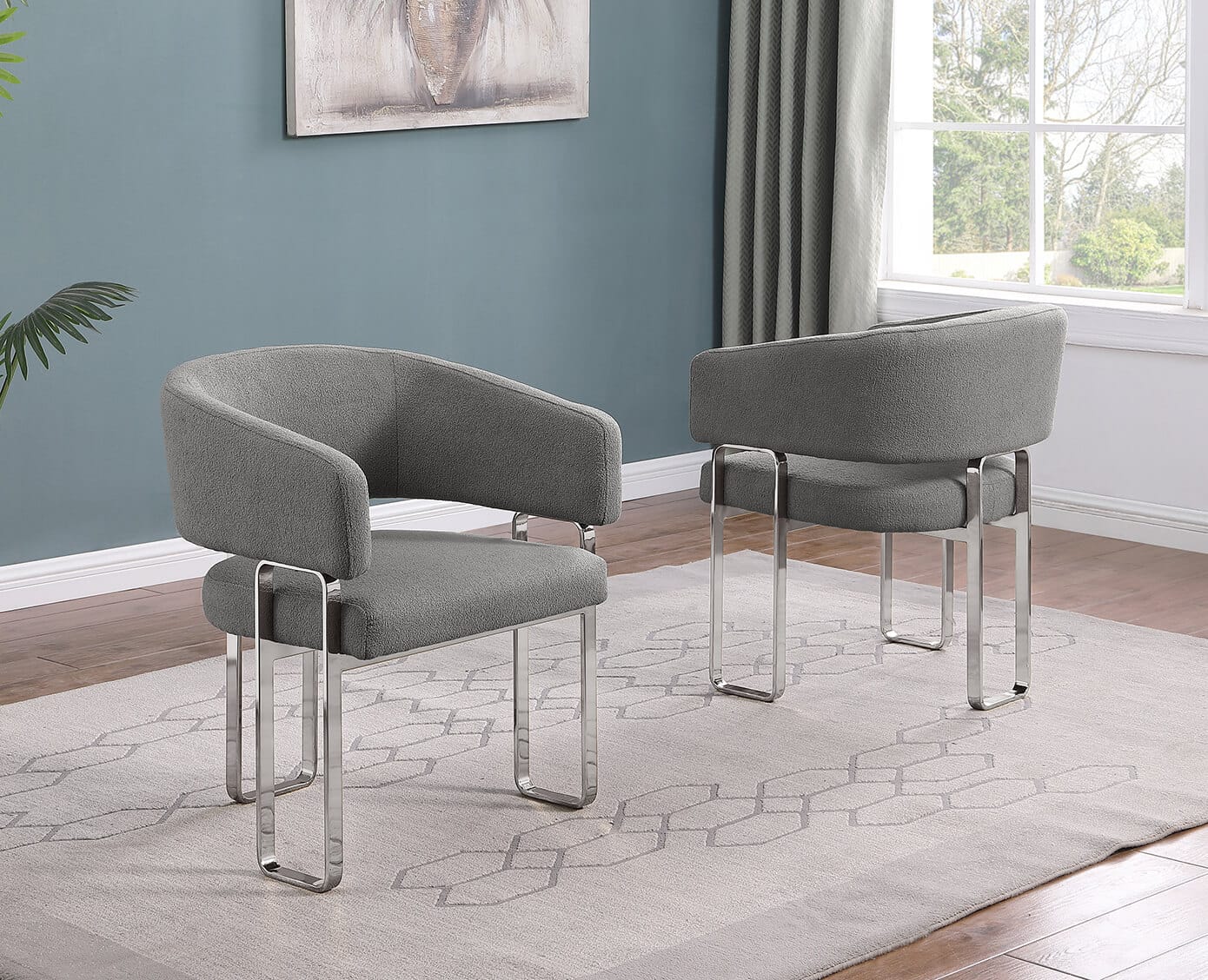 Create a sophisticated look in your dining space with these teddy fabric side chairs with modern barrel design. Paired with chrome plated legs and tri-leg base, these chairs will surely elevate your home.